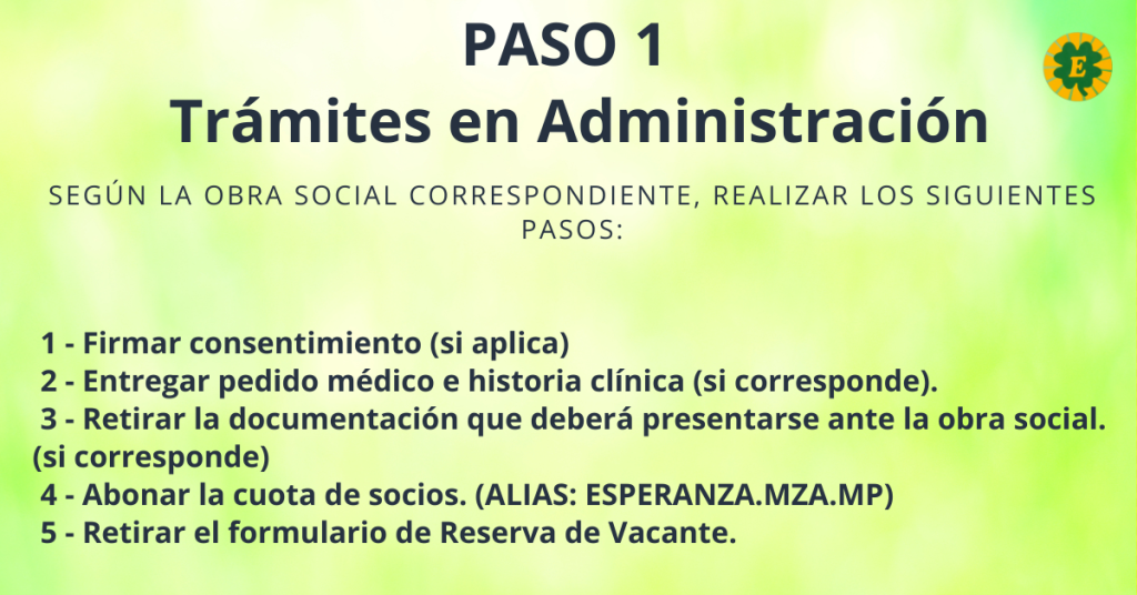 En aquellos casos en que la Obra Social realiza los pagos directamente a EL RESPONSABLE, estos se comprometen a depositar o transferir el mismo monto antes del transcurso de 5 días hábiles contados a partir de la recepción de los respectivos valores. Los montos exactos serán depositados o transferidos a la cuenta corriente en pesos del Banco Nación Nº 6280061558 CBU: 0110628820062800615589 a nombre de Asociación Esperanza, CUIT: 30-61827228-8. Una vez realizado el depósito o transferencia deberá entregar en la oficina de Administración de la Asociación Esperanza copia del comprobante de depósito o podrá enviarlo al e.mail: administracion@asociacionesperanza.com.ar, a fin de que sea emitido el recibo correspondiente. Ante un atraso o inconveniente con respecto al pago de las cuotas por parte de la Obra Social, EL RESPONSABLE, deberá comunicarlo formalmente a la Administración de la Asociación Esperanza.