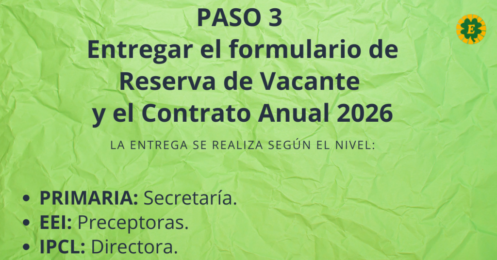 2°) RESERVA DE VACANTE: EL RESPONSABLE, en las fechas que determina LA INSTITUCIÓN –indefectiblemente- deberá realizar la RESERVA DE VACANTE para próximo ciclo lectivo del ESTUDIANTE.